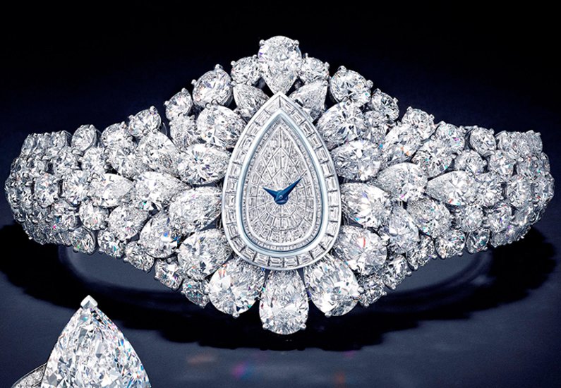 Graff, a British jeweler known for rare diamonds, created The Fascination as an extraordinary fusion of watchmaking and gem artistry. This stunning watch features 152.96 carats of white diamonds. At its center is a detachable, 38-carat pear-shaped diamond that transforms into a ring.
